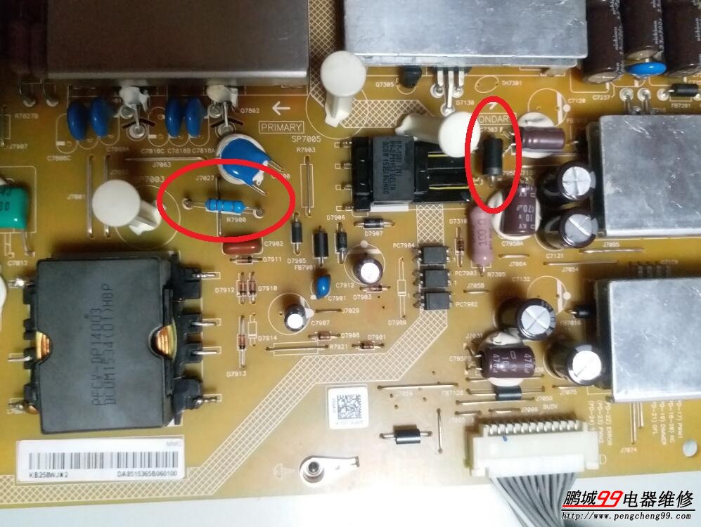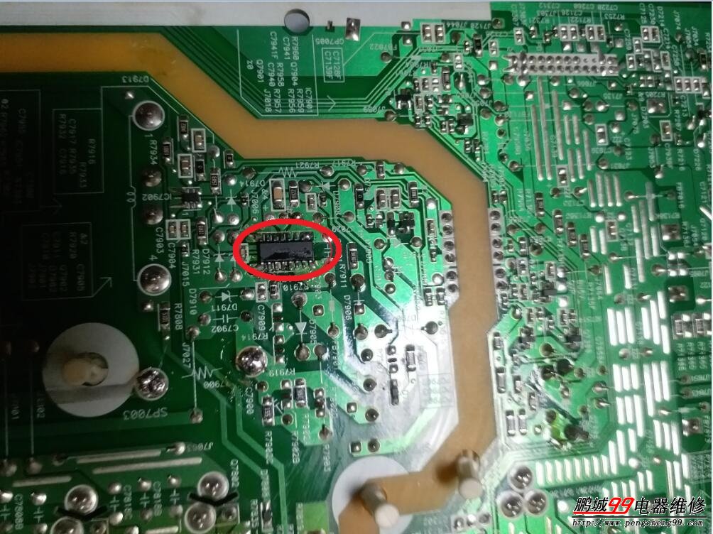 給電源板單板通電測量,大電容兩端300V電壓正常,順著電路往5V開關(guān)變壓器處測量,沒了300V輸入了。斷電后給大電容放完電后再測量,大電容的正極300V到5V開關(guān)變壓器初級引腳的電路不通了,再順路測量,位號R7900/2.2歐姆的限流電阻已經(jīng)開路了,再順路測量到位號IC7903/型號DAP021的5V電源芯片擊穿短路了。第一次見這個(gè)型號的電源芯片,手里頭也沒貨,只好跟用戶講拆板帶回去修了。