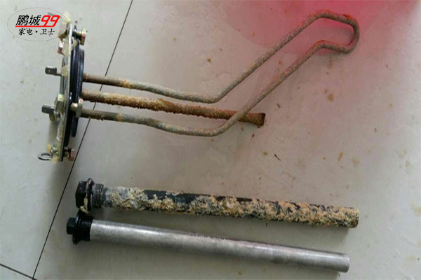 第一張圖片是熱水器內(nèi)部的加熱絲和鎂棒,第二張圖片是熱水器簡單清洗后放出來的臟水,第三張圖片是電熱水器內(nèi)部結(jié)構(gòu)的切面。