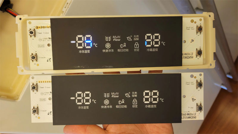 第一次維修三星對(duì)開門冰箱時(shí),修完冰箱之后再插電顯示變成這樣了,修冰箱之前顯示還是正常的,我還以為是顯示板壞了,不得已又買了一塊同樣的顯示板裝上,如下圖: