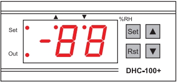 正常顯示狀態(tài)下,當(dāng)濕度測量值處于濕度設(shè)定值和回差之間,或傳感器故障時,同時按住 Set 鍵和Rst鍵持續(xù)3秒以上可以手動切換加濕/除濕輸出。